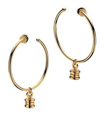 Bulgari宝格丽B.zero1 黃金大箍耳坠。中央的活动式坠饰串吊着品牌鐫刻碟盘,是传统克里奧尔式耳坠的全新创意诠释。