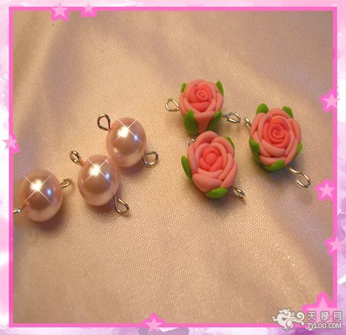 (2)先把大的珍珠和软陶花用9针穿起,两头弯成圈,待用