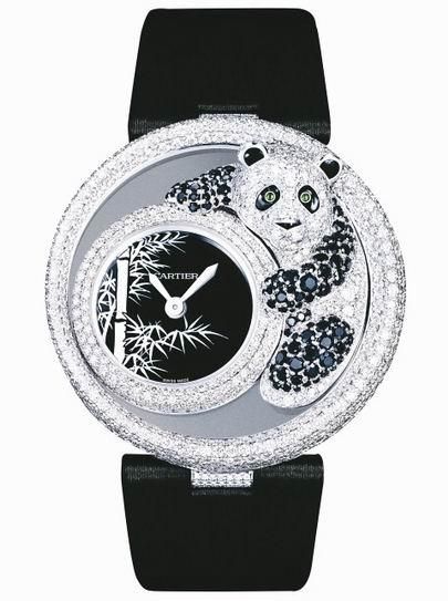 :在热闹的钟表动物王国之中,最惹人怜爱的应数大熊猫,这只卡地亚动物马戏团系列的腕表以黑色蓝