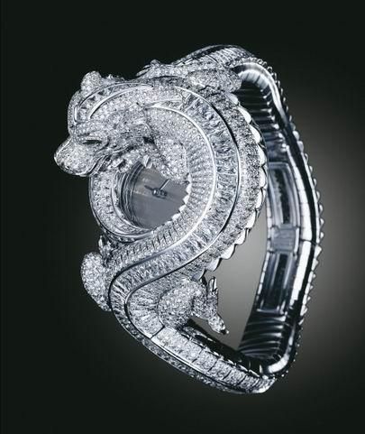 卡地亚麒麟造型高级珠宝腕表:蓝宝石水晶镜面,81003S MC型手动上链“神秘”机械机芯、19枚红宝石轴承、18K白金镀铑表壳和表链、18K金指针、173颗公主方形切割钻石(共重约12.47克拉)、1724颗明亮式切割钻石(共重约12.5克拉)、2颗马眼形切割祖母绿镶嵌眼睛(重约0.18克拉)。