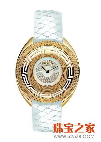 金色表盘与绸缎表带显示了这款Destiny腕表的与众不同。经典的希腊回纹是Versace这款腕表最特别的设计。