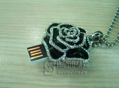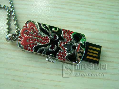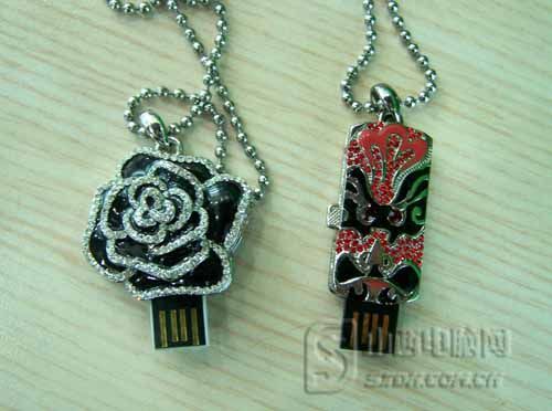 珠宝系列U盘有玫瑰花和脸谱图案,外壳为不锈钢材质,还镶有水钻,看起来金光闪闪,非常高贵大气,并且带有挂链,如项链一样漂亮,可当作装饰挂在脖子上,赢得不少女孩子的喜爱,让人爱不释手。