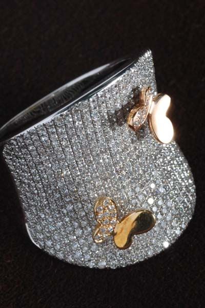 在欧美一路走俏的夸张奢华款珠宝,在亚洲尤其是韩国、日本和中国市场却并未引起大的拥趸。或许是中国人含蓄内敛的审美倾向和追求设计的内在含义,这款"蝶吻"戒指在设计上大胆地将钻石密镶在宽大的戒指表面,柔润的线条上是两只可爱的蝴蝶轻舞飞扬。恒信钻石宫殿的珍宝巧妙地将东西方文化融为一炉,运用自古流传的梁祝化蝶的爱情故事,让现代的珠宝顿时具有了一种东方的飘逸禅韵。