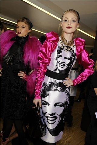 Dolce & Gabbana 这款项链有这么多层次,开始我们还以为是戴了好几条,只有一条的话倒是方便了许多。金色、银色、密镶水晶,看起来华丽,实际链条的主体部分都是普通锁链,只是每一条的宽窄、粗细都不一样。最可爱的是外圈的贵妇狗吊坠,跟模特夸张的服装搭配在一起效果不明显,只看单品的话就还是蛮有喜庆的,让我们提前感受到圣诞节的气氛。 本季 Dolce & Gabbana 秀场上有许多夸张肩部的服装,袖子很容易分散人的注意力,只有存在感如此强烈的项链才能聚拢视线,让观众关注到整体造型。现实生活中我们不会穿太夸张的服装,但这条项链同样能把所有的视线吸引到你的脸上,让人注意到你的个性。