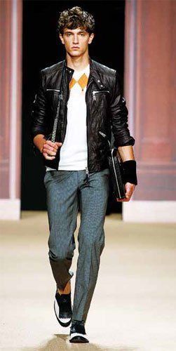 在很多人眼里,机车夹克,太过不羁,穿上身立刻变成“真的汉子”。不想要太过Street Fashion 的感觉,就应该向秀场借镜。Enrico Coveri与Frankie Morello 今年都大力提倡机车夹克搭配西裤,完全洗去太过街头的味道。一双斯文的皮鞋,更是让气质加分不少。白色打底衫乃是造型必须,贴身的棉质T 恤,或是菱纹装饰的针织衫,都是本季最为Basic 的必入单品。