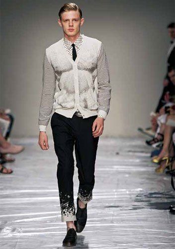 意大利的Moschino,一直以来是玩幽默的个中高手,在本季男装秀场上,模特儿穿着条纹的针织衫与印花衬衫,典型的意大利式浪漫。不过细心留意就会发现,原来那开襟针织衫的条纹图案用艺术形式,幻化成猛男的胸肌与腹肌,像穿了他人肉体一般,令人会心一笑。